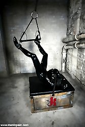 Claire Adams has a new toy named rubberboy. He comes complete with operating manual, full rubber wardrobe, an assortment of enormous ass toys, and a submissive demeanor conducive to the most sophisticated, sadistic palate. Miss Adams wastes no time in stretching his ass with a huge, electrified ass plug that firmly confirms his status for the day. Hooded and enclosed in rubbber, he is then worked through several positions that leave him vulnerable and available to the delightfully twisted dominatrix, and she takes full advantage by whipping, slapping, squeezing and fucking his ass with the largest strapon we have ever seen here at MIP.